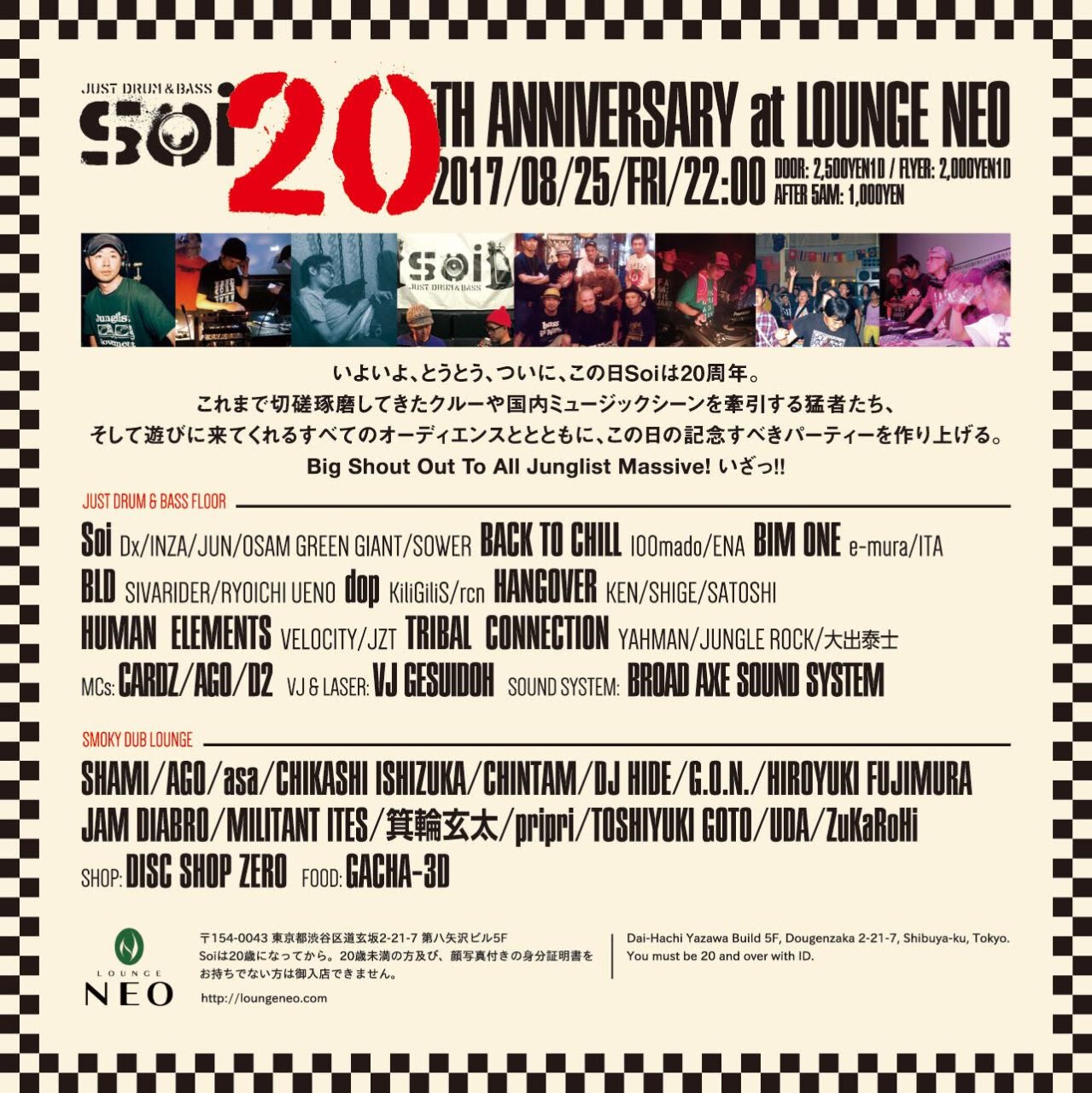 いよいよ、とうとう、ついに、この日Soiは20周年。これまで切磋琢磨してきたクルーや国内ミュージックシーンを牽引する猛者たち、そして遊びに来てくれるすべてのオーディエンスととともに、この日の記念すべきパーティーを作り上げる。Big Shout Out To All Junglist Massive! いざっ!!