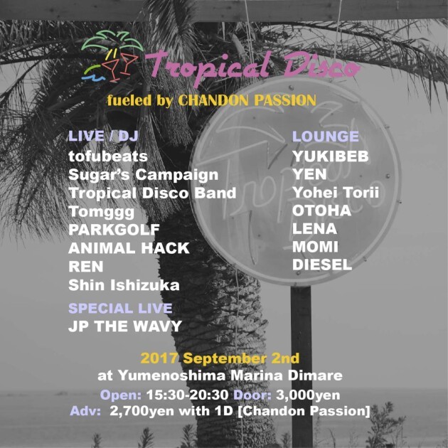 Tropical Disco主催、今夏最後の野外パーティー!tofubeats, Sugar’s Campaignら豪華ラインナップ決定!