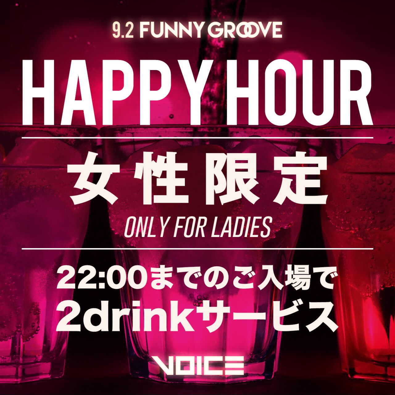 ≪HAPPY HOUR≫21-23時にご入場の女性のお客様は更に+1Drinkサービス!