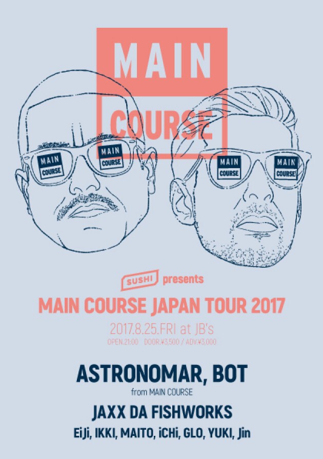 レーベル設立後数年で世界的に人気のアンダーグラウンドレーベルに成長したMain Course。昨年、日本主要4都市を回ったJAPAN TOURも記憶に新しい彼らが、SUSHI RECORDSとのコラボマーチャンダイズを用意して、真夏の日本に帰ってくる!
