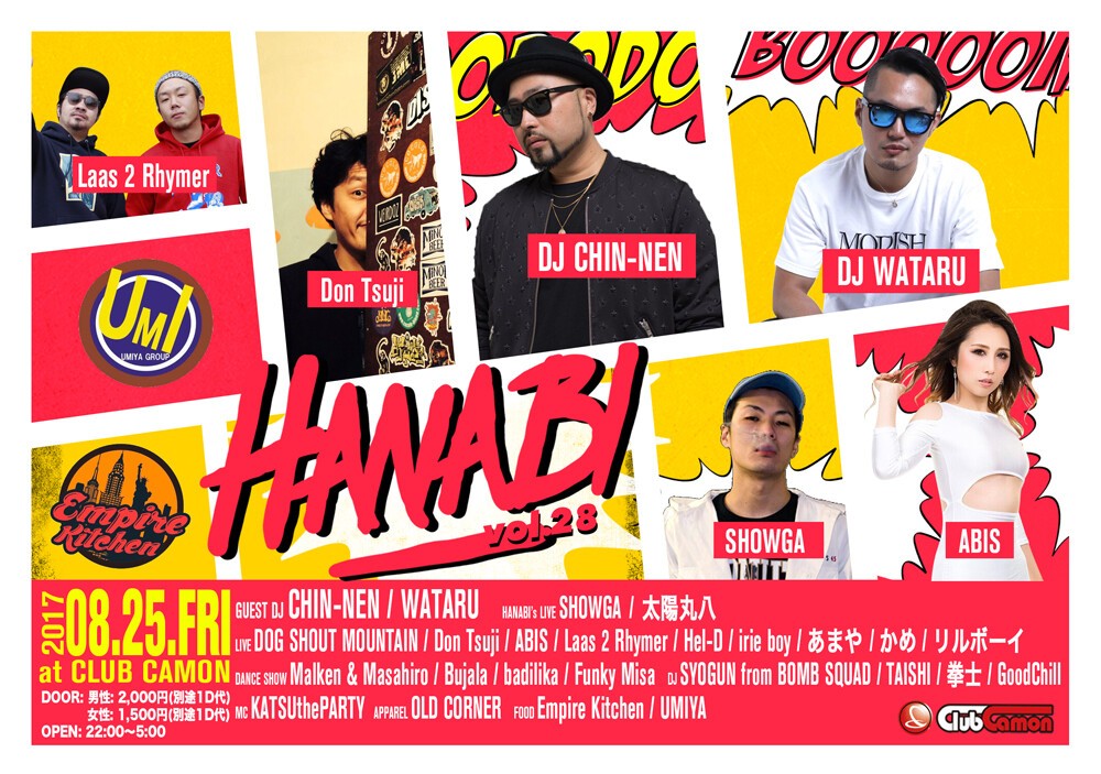 【HANABI vol.28】8/25(金)☆衣食音をコンセプトとするEVERY 4th FRIDAY PARTY『HANABI』★★GUEST DJにDJ CHIN-NEN、DJ WATARUが登場☆☆毎回各方面の多才な花火師達が登場★★