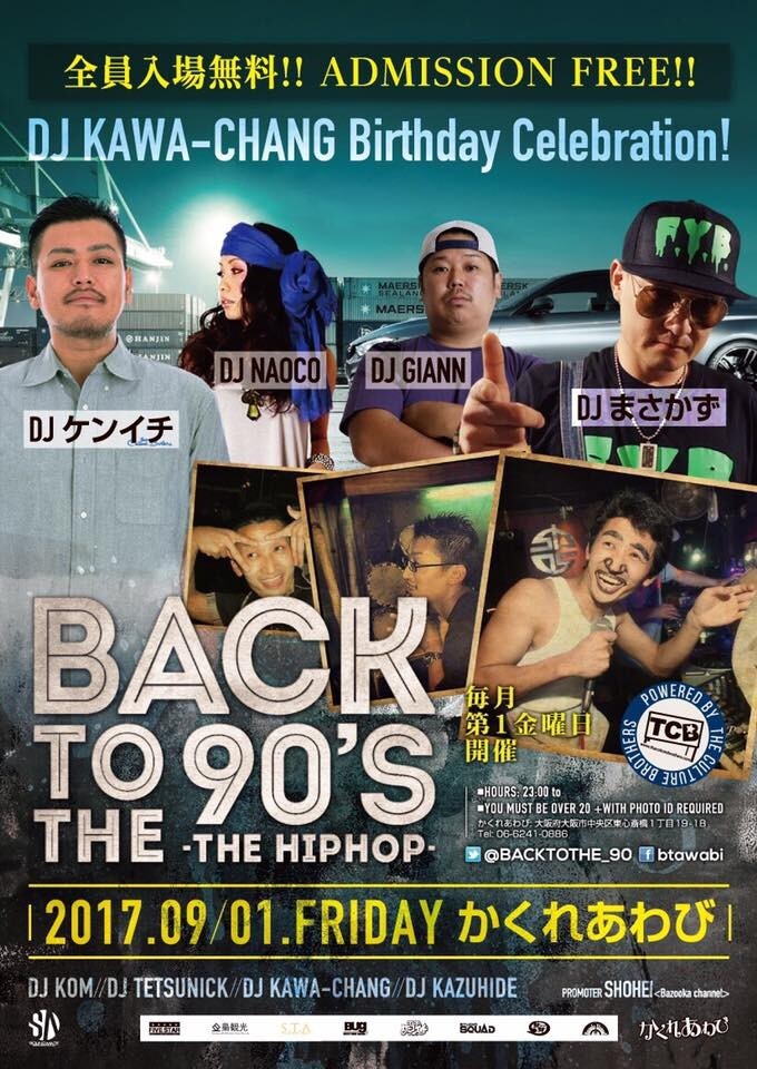 話題の超ド級で古き良きHIPHOP.R&B PARTY『BACK TO THE 90's』他では味わえない当時のHIPHOP PARTYを再現!まさかず,NAOCO,ケンイチと間違いないDJで朝まで盛り上げます!皆さん4日の金曜日はかくれあわびでお待ちしてます。今回は〜DJ KAWA-CHANG〜Birthday Cerebration!