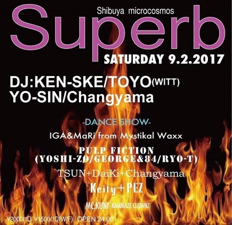 DJタイムとダンスショーケースという組み合わせで一晩を演出し、あらゆるクラウドを魅了しているパーティー"Superb"! 今回はIGA & MaRi / PULP FICTION / TSUN, Daiki, Changyama / Keity+PEZの4組がダンスショウケースに登場。KEN-SKE,TOYO,YO-SIN,ChangyamaのDJ陣と共に一晩を盛り上げる。 夏はまだまだ終わらない!9月2日の土曜日は踊りに、飲みに、騒ぎに、ぜひMICROCOSMOSへ!