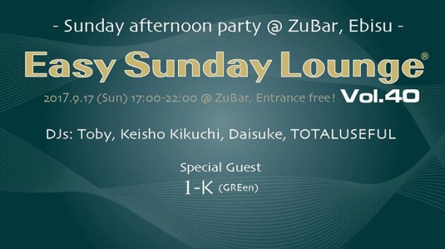 オトナに優しいアンダーグラウンド、 Easy Sunday Lounge Vol.40! 今回は1-K (GREen)が久々にDJしてくれます。乞うご期待!