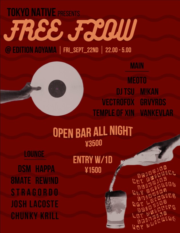 Tokyo Native presents: Free Flow. Start off the weekend right with great music and free flowing alcohol, all night long! 7 hours of open bar for only ¥3,500; you’re not going to find a better deal than this anywhere else!