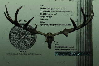 アクトには「Berghain」や「Toresor」などの海外名門クラブでもプレイし、今年4月のアルバム「I Am Goodbye」のリリースにより世界的な評価が一層高まっているテクノDJ/プロデューサーのGo Hiyamaと、類い稀なMIXセンスとスクラッチを織り交ぜたビートサウンドにより多くののHIPHOPファンから支持されているDJ FUNNELの2人が1月の波紋@静岡dazzbarでの好評を受け再び登場。またブレイクビーツレーベル「Insector labo」の代表として2000年代に唯一無二の鋼鉄サウンドで日本のBREAKBEAT/ELECTRONICAシーンに変革をもたらしたビートクリエイター・CHAOSが待望の現場復帰。さらに、膨大な音楽的引き出しと物語性のあるMIX展開を特徴に音楽ストリーミングサイトmixcloudでは5000人を超えるフォロワーを持つJyunya Hiraga、90年代中期よりDJ/オーガナイザーとして自身の「Forte」などのクラブイベントや野外パーティーなどを開催し近年では茶澤音楽館@orbitなどで活躍しているDai、硬質なビートをクラシックのバックボーンを持つ彼女ならではの詩情が覆う独特のTECHNO/HOUSEの表現で都内クラブシーンで評価が急上昇しているMISA、という波紋らしい実力者揃いのラインナップとなっている。
