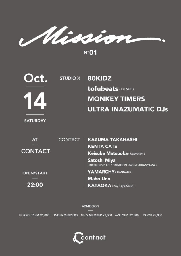 様々なシーンの垣根を越えて活躍を続ける80KIDZが主催する新パーティー“MISSION”。STUDIO XフロアにULTRA INAZUMATIC DJs等、それぞれのスタイルでダンスミュージックを体現するDJ達が出演、CONTACTフロアには80KIDZと親交のあるDJ達が出演する。