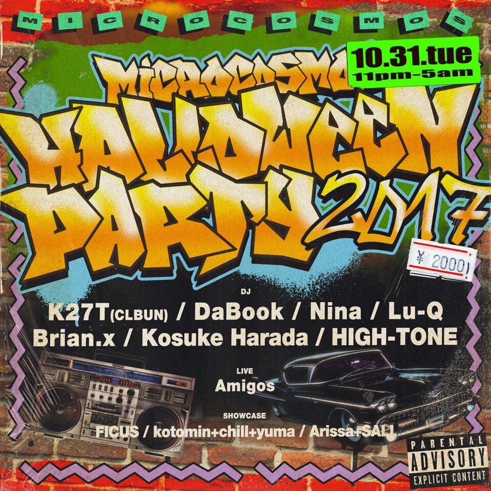 10月31日HALLOWEEN当日。 ここ渋谷MICROCOSMOSではHALLOWEENにふさわしい今勢いのあるパンチの効いたアーティストが多数出演する。 LIVEにはAmigosの出演、Show caseにはFICUSが、DJ軍にはパーティを盛り上げる面々がHalloween使用で勢揃い。 Halloween当日は渋谷の街を思う存分仮装で楽しんで欲しい。