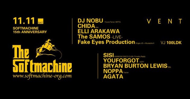 For this very special night, we will have DJ Nobu who hails around the world with irresistible force, CHIDA, ELLI ARAKAWA, The SAMOS -Live-, and last but not least Fake Eyes Production (Shigeo JD+Mustache X). With all the DJs SOFTMACHINE loves, the night will be carved in your brain like a TATTOO!