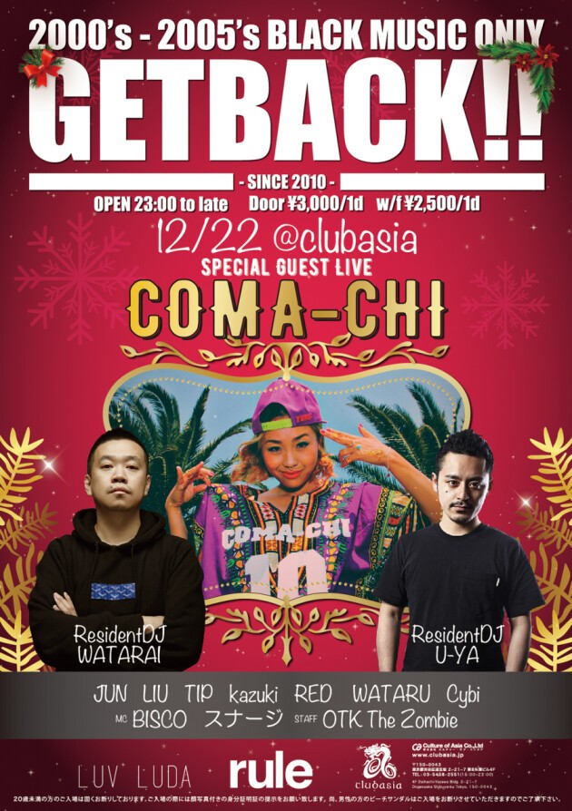 Resident DJ U-YAを筆頭に2000-2005年産HipHop/R&B/Reggaeオンリーで構成されるイ ベント『GET BACK!!』、