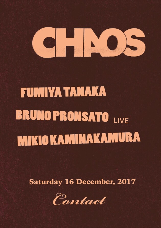 Contactに拠点を移して3回目の開催となる"CHAOS"では、前回5月のパーティに出演したZIPが主宰するPerlonのレーベルアーティストでもあり、今年6月にFoom MusicからLP 「US Drag」を発表したBruno Pronsatoがライブを披露する。田中フミヤのレーベルUntitled Recordsから2作目となるEPをリリースしたばかりのMikio KaminakamuraがStudioフロアのオープニングを飾る他、dj masdaとSo Inagawaが主宰するCabaret RecordingsからEvan BaggsとのユニットEkboxでの新作リリースも予定されているKatsuya Sanoがベルリンより帰国してContactフロアでプレイする。