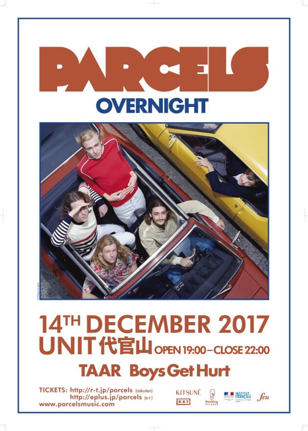ディスコやファンク、エレクトロと5人のハーモニーがミックスされたフューチャー・レトロ・バンド、PARCELS(パーセルズ)。キーボードのPatrick Hetherington とLouie Swain、ベースのNoah Hill、ギターのAnatole Serret、そしてドラムのJules Crommelinから構成され、それぞれがボーカルも担当する。2014年にオーストラリアで結成され、もともとはフォークやメタルも演奏していたという彼らは、高校の卒業が迫るころにデビューEPを制作。高校卒業後にベルリンへと拠点を移した。その後すぐに、レーベル<Kitsuné>の目に留まり、以後、KitsunéよりシングルやEPをリリースする。最新シングル「Overnight」はなんとあのDaft Punkが全面プロデュースを手掛けており、そのハイファイなディスコ・サウンドは、すでにPitchforkやFADERといったメディアでも大絶賛を受けている。今、音楽界はもちろんファッション・シーンなど、あらゆる方面から