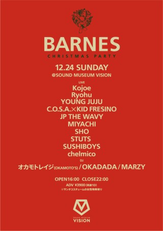 2017年を彩った次世代クリエイターアーティストが集結し数々の熱狂を生む新PARTY “BARNES” 初開催である。 注目のLIINE UPはKANDYTOWN としての躍進ぶりは勿論のことAun beatzでの活動や、過去にはズットズレテルズのメンバーとして伝説を残したRyohu、同じくKANDYTOWN所属、今年tofubeatsとの”LONELY NIGHTS”でシーンの話題をさらったYOUNG JUJU、 愛知の知立市をレペゼンするC.O.S.A.と現在NYに拠点を置くKID FRESINOによるスペシャルユニットC.O.S.A. × KID FRESINO、 突如現れたニューヨーク生まれニューヨーク育ちのバイリンガルラッパー MIYACHI、 代表曲”ヤクブーツはやめろ”のYOU TUBEが話題になり今や渋谷のアイコンとなりつつあるSHO・彗星の如くあらわれ「超WAVYでゴメンね」で社会現象を起こしたJP THE WAVY などが登場する。 その他にもまだ正式発表出来ないのは残念だが、その名前に歓喜に沸くアーティストが登場する。