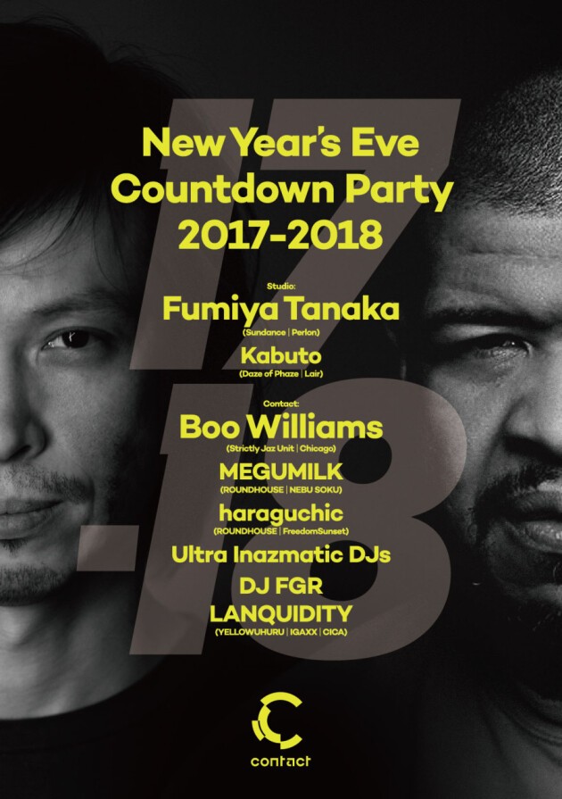 昨年より自身のパーティ”CHAOS”もContactへとベースを移して開催中の田中フミヤが、ファン待望の元旦ロングセットを敢行する。そして、Contactバーフロアでは、盟友、Glenn Undergroundと共にStrictly Jaz Unitを結成し、シカゴハウスシーンを90年代から支えてきたベテラン、Boo Williamsが6年振りの来日を果たす。