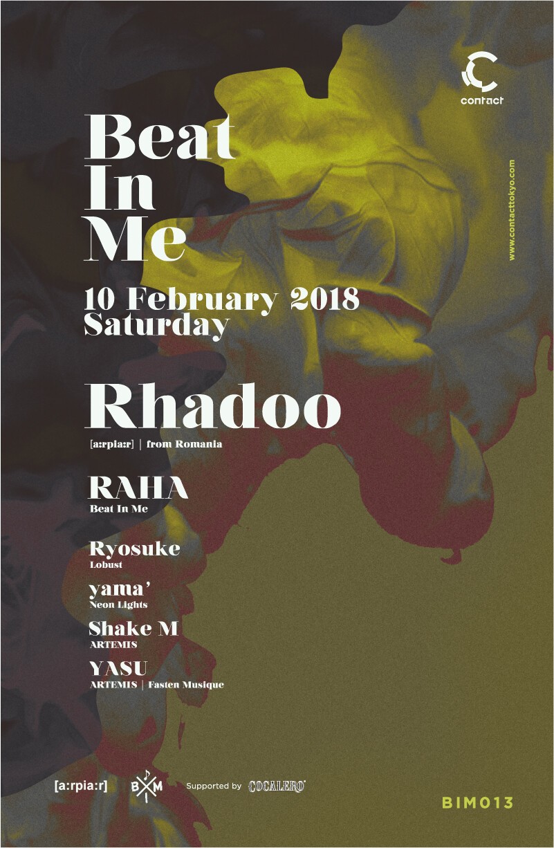 Rhadoo, an important figure in the underground scene, will be making his 5th appearance, including the project RPR SOUNDSYSTEM, for Beat In Me. Supporting act in the Studio floor is resident DJ Raha. Contact floor will be navigated by top notch local DJs Ryosuke, yama’, Shake M and YASU.