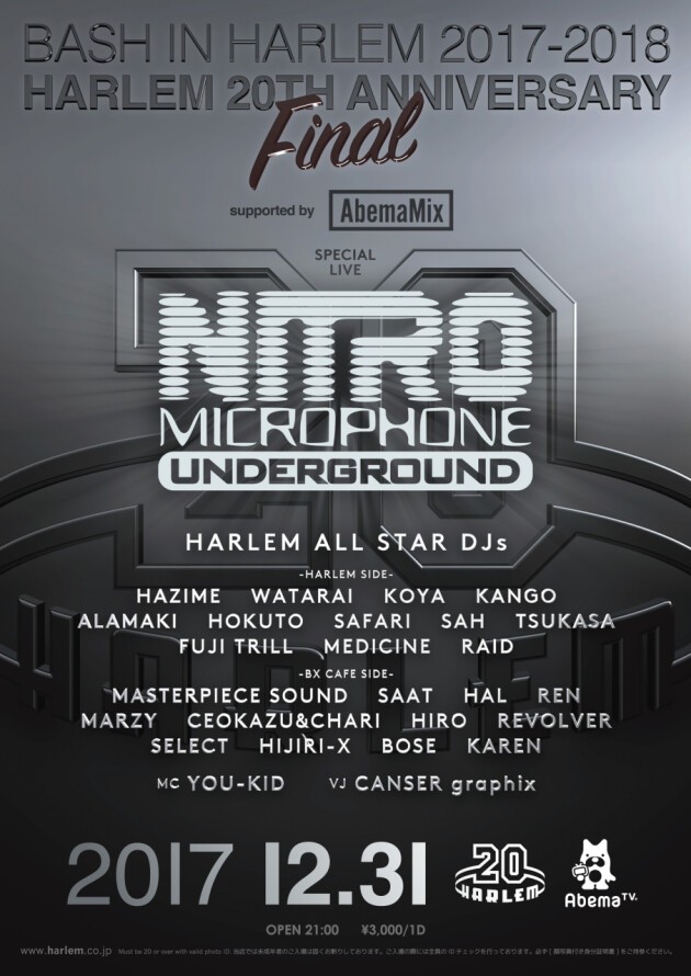 NITRO MICROPHONE UNDERGROUNDが、12/31(日) "BASH IN HARLEM 2017-2018 HARLEM 20th ANNIVERSARY FINAL"に特別出演決定!!