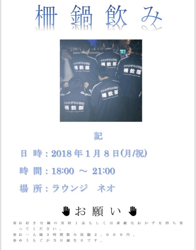 ◎ 美味しい鍋の具材 or お惣菜1品持ち込みお願いします。