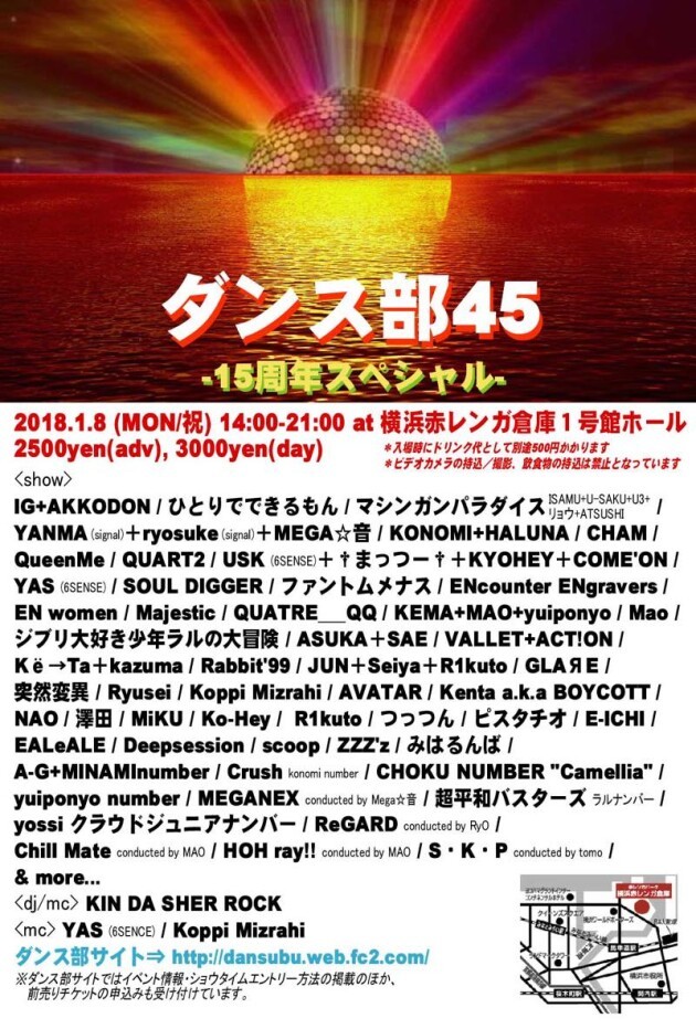 デイタイムの大型ダンスイベント「ダンス部」が15周年を迎え、1/8に赤レンガ倉庫にて開催される。