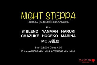 2018.1.7(Sun)祝前日 【NIGHT STEPPA】 at ZAKURO Start 22:00 / Close 4:00 Entrance ¥1500 with 1 drink ADV ¥1000 with 1 drink