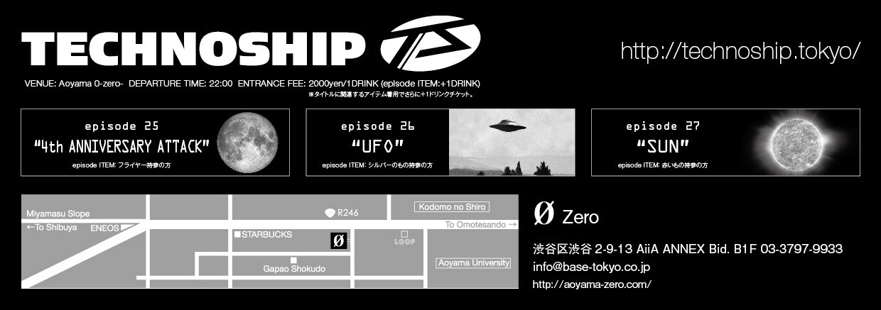 テクノミュージックによる宇宙航海をコンセプトにクラブ本来のアンダーグラウンドで上質なテクノを楽しみ尽くせる形を追求したパーティ”TECHNOSHIP”。