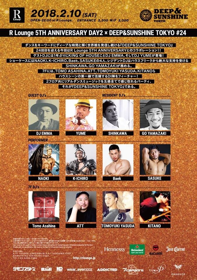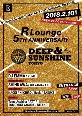 ダンスをキーワードにディープな時間と輝く世界観を発信し続けるDEEP&SUNSHINE TOKYO 24回目を迎える今回はR Lounge 5th ANNIVERSARYとのコラボレーション! ゲストDJには1年ぶりにKING OF HOUSEことDJ EMMAが登場!!