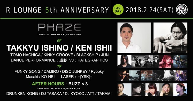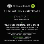 R Lounge 5th ANNIVERSARYの最終日を飾るのは毎週水曜日にR Loungeにて開催しているテクノ&ハウスパーティ『PHAZE』をフィーチャー! ヘッドライナーには電気グルーブの石野卓球、テクノゴッドKEN ISHIIが登場!!
