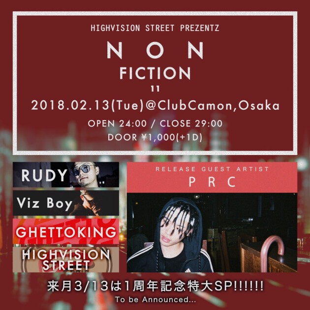 【NON-FICTION】2/13(火)☆毎月第2火曜開催HIGHVISION STREET presents『NON-FICTION』☆☆RELEASE GUEST ARTISTにPRCが登場☆☆次世代のアーティスト多数出演★★