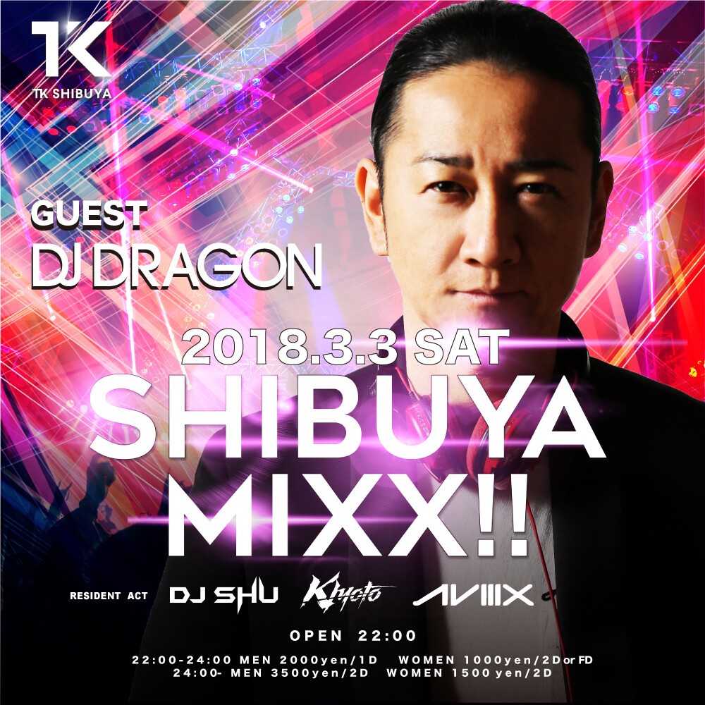 毎週末開催!TK SHIBUYAが誇る週末看板パーティー! LED ロボット,GOGOダンサー,ポールダンサー、度肝を抜く空間演出に加え、各地で活躍する豪華GUEST DJを招いて毎週末1500名規模のオーディエンスが熱狂するSHIBUYA MIXX!!