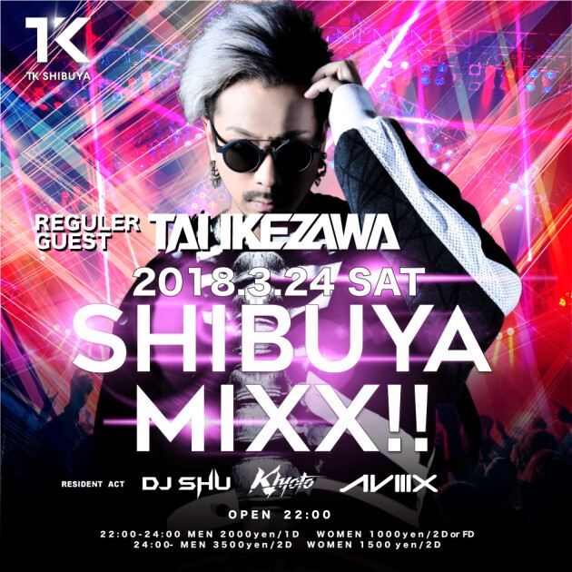 毎週末開催!TK SHIBUYAが誇る週末看板パーティー! LED ロボット,GOGOダンサー,ポールダンサー、度肝を抜く空間演出に加え、各地で活躍する豪華GUEST DJを招いて毎週末1500名規模のオーディエンスが熱狂するSHIBUYA MIXX!!