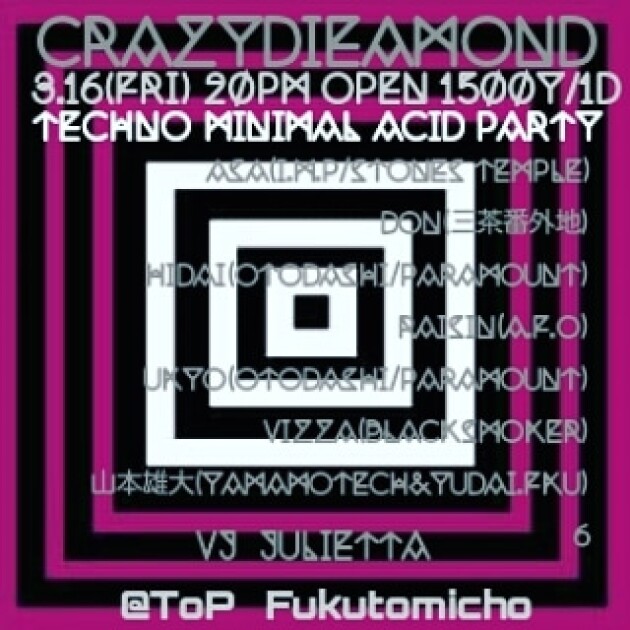 Crazy Dieamond @TOP Fukutomicho 2018.3.16(Fri) 8pm Open 1500yen/1D Techno,minimal,Acid Party!! ASA(i.m.p/Stones temple) DON(三茶番外地) HIDAI