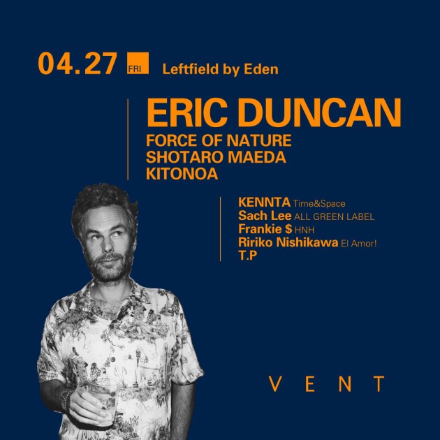This time Eric Duncan will appear at "leftfield" produced by "eden" Tokyo's long-run party. Organizer SHOTARO MAEDA, FORCE OF NATURE by KZA & DJ KENT who successfully done Europe tour, and KITONOA will make the floor hot at its max!!