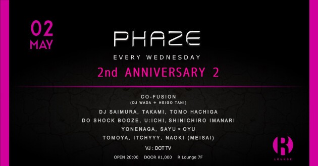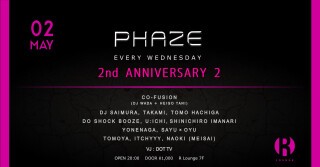 2016年4月に毎週水曜日のR LOUNGEにてスタートしたPHAZEが2周年を迎える! アニバーサリーパーティ第2回目となる今回はヘッドライナーにCO-FUSIONがDJ SETで登場!