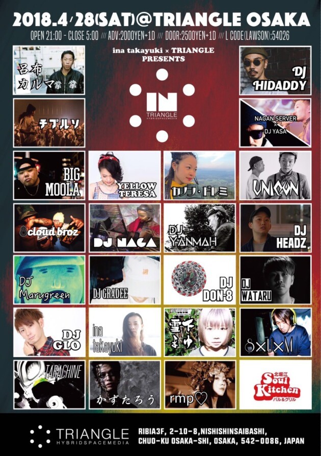 名古屋を中心に日本各地で活躍するアーティストina takayukiと大阪アメ村のクラブTRIANGLEがスペシャルコラボパーティーを開催決定!!!!!!呂布カルマ、チプルソ、韻踏合組合からHIDADDY、NAGAN SERVERなど豪華出演者で開催!!!!!!