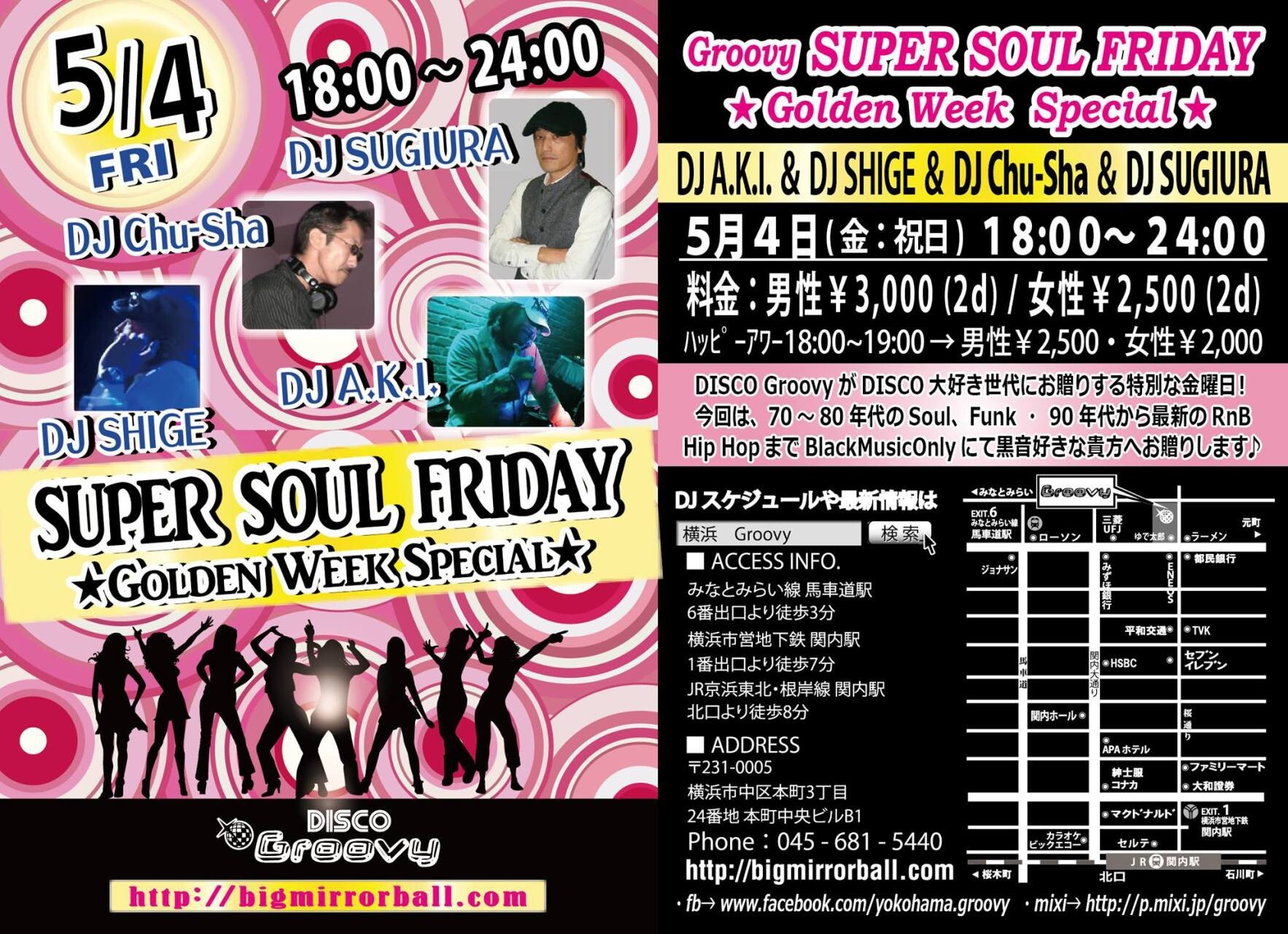 DISCO Groovy が ディスコ大好き世代にお贈りする特別なフライデー! 今回は【SUPER SOUL FRIDAY】にて BLACK MUSIC ONLY★ 70、80年代の Soul、Funk ・ 90年代から最新の RnB、Hip Hop まで幅広くお贈りします♪ ゴールデンウィークのスペシャルな華金夜を皆様でどうぞお楽しみ下さい!