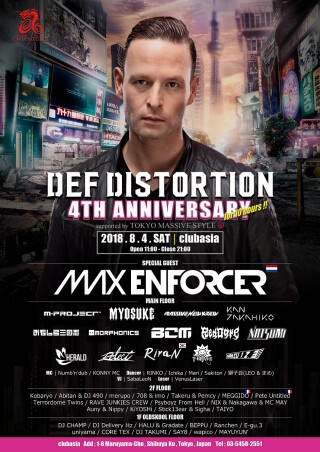 DefDistortionは、2014年8月に横浜で誕生。日本では数少ないHardstyleのパーティーとして、ファンのニーズに応えるべく毎月第1土曜日開催を休まず継続。総開催数は50回以上!4年の節目を迎える今回は、Atmozfears、Code Black、Wildstylez、Zatox等の来日をサポートしてきたTokyo Massive Style協力の下、開催史上最大規模となる渋谷clubasiaにて、10時間にわたり開催!2016年のAdrenalize、2017年のRefuzionに続き、スペシャルゲストには、”Lost in Paradise”、”WKND”等のヒット曲をリリースし、世界のHardstyleシーンの第一線で活躍するビッグアーティスト、Max Enforcerの来日が決定!Defqon.1やQlimax等にも出演する世界レベルの彼のプレイを間近で見れるチャンス!更に国内出演陣も、Hard系イベントで活躍する人気アーティストに加え、各地で活躍するDJ達がこの日のためにclubasiaに大集結!Hardstyleに限らず、多種多様なジャンルを楽しめる年に一度の特別仕様!総勢70名を超えるDJ、ダンサー、演出チームによるハードなダンスミュージックの祭典、DefDistortionをどうぞお楽しみに!8月4日㈯は渋谷clubasiaにてお待ちしております!