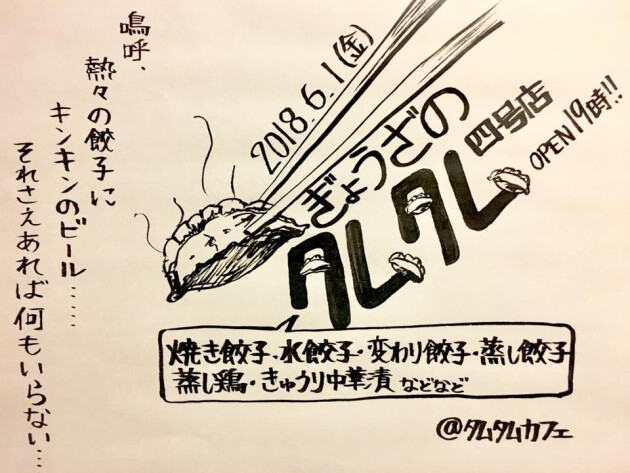 2年振りに『ぎょうざのタムタム』開催!嗚呼…熱々の餃子にキンキンのビール…それさえあれば何もいらない…定番!焼餃子/ツルツル!水餃子/変わり餃子/蒸し餃子/蒸し鶏/きゅうり中華漬けetc をご用意してお待ちしており〼