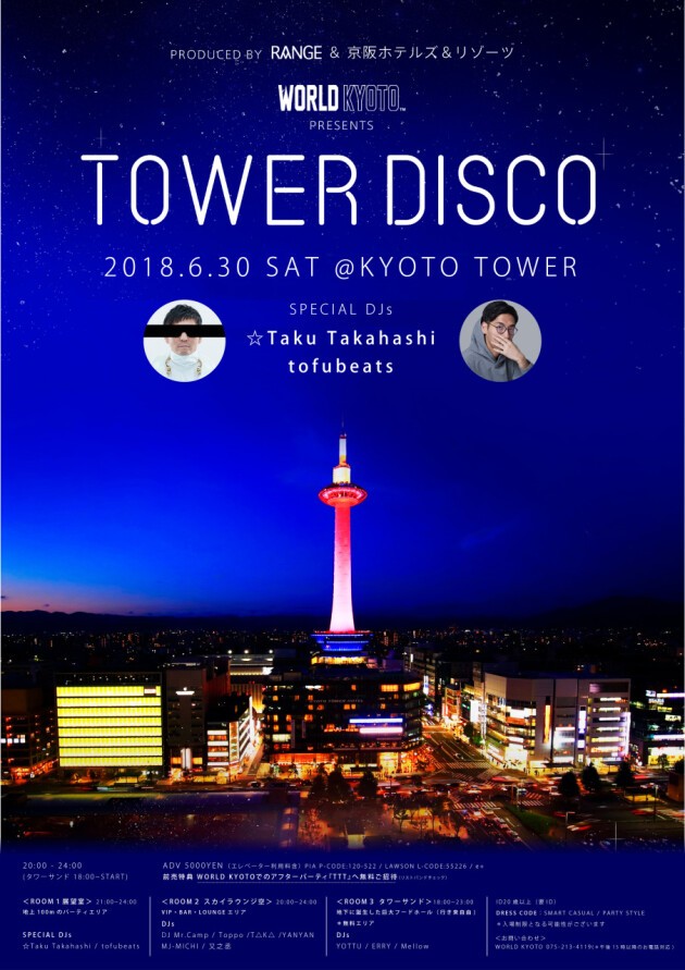 今回はm-floの再結成で今年の夏フェスをジャックしている☆Taku Takahashi氏、インターネットを利用して楽曲の発表を行うことでWIRE出演や森高千里をはじめ、佐々木希、YUKI、ももいろクローバーZなど大物アーティストとのコラボレーションを成功させるなど、平成生まれ世代のトラックメーカーとして活躍する tofubeats氏が登場!京都タワー展望台(前半)とワールド(後半)での同日二箇所パーティを堪能してみては!
