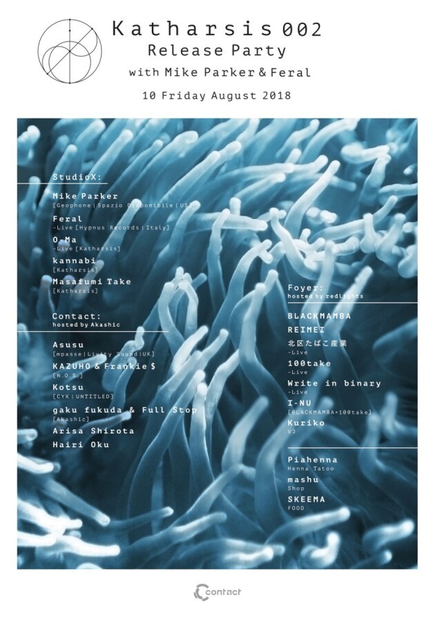 Masafumi Takeとkannabiによるテクノレーベル"Katharsis"が、2nd EPのリリースを祝してリリースパーティを開催する。ゲストには、圧倒的な個性をもってテクノシーンで存在感の示し続けてきたアメリカの巨匠、Mike Parkerが登場。日本では約2年ぶりとなるDJセットをプレイする。さらに、現代ディープテクノを代表するレーベル"Hypnus"から着実にリリースを重ねるイタリアの若き才能、Feralが日本初となる渾身のライブセットを披露する。