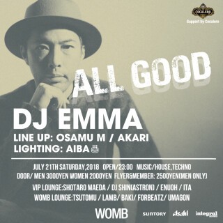 DJ EMMA will be making his long-awaited return to WOMB's main floor. The name of the party will be "ALL GOOD!". At WOMB, DJ EMMA has served as resident DJ for TROUBLE HOUSE over many years and is a legendary artist who has been continually active since the genesis of the Japanese club scene. In addition, with his BACK 2 BACK performance together with KEN ISHII at the WOMB Anniversary still fresh in the memory, OSAMU M, together with the talented young female artist AKARI, will be in support. What's more, AIBA, who will be in charge of the LIGHTING, will be celebrating his birthday on the same day! Let's make it a night to remember with some quality HOUSE MUSIC!
