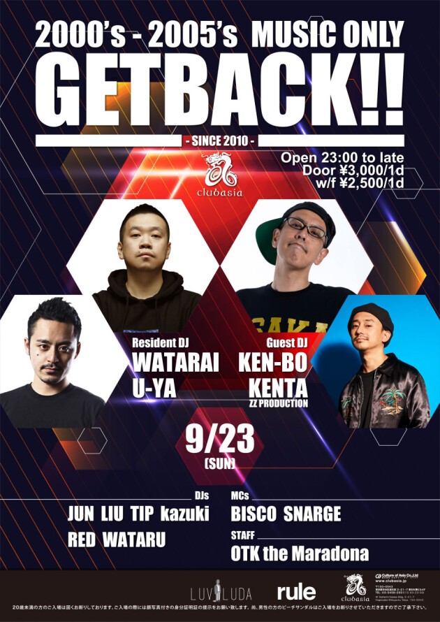 Resident DJ WATARAI、DJ U-YAを筆頭に2000-2005年産HipHop/R&B/Reggaeオンリーで構成されるイベント『GET BACK!!』、 毎回OPENから長蛇の列で満員御礼。