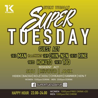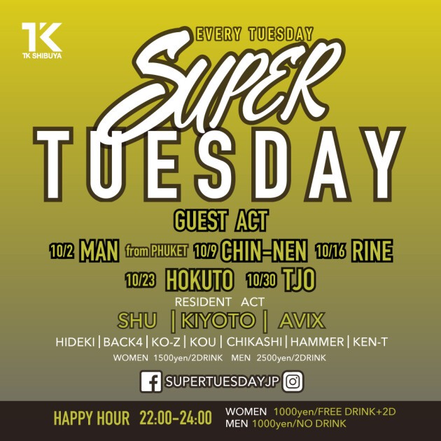 東京の遊びの中心「渋谷」の新たな遊び場「TK SHIBUYA」が、毎週火曜日に開催するパーティー「SUPER TUESDAY」!この「スパチュー」ではEDMは勿論、HIP HOPやベースMUSIC等、今、世界で主流の音楽がジャンルレスに体感できる!豪華なレギュラーDJ陣に加え毎週多彩なゲストDJを招き、他の平日では味わえない最高の夜をお楽しみ頂けます!