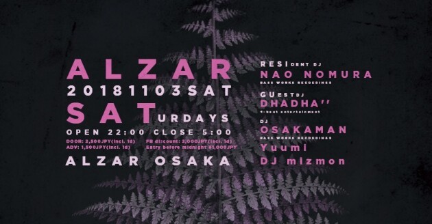 国内テクノレーベルBASS WORKS RECORDINGSを運営するNAO NOMURAが放つ毎月第1週目のALZAR SATURDAYS。 ゲストにはベルリンを拠点に活動し、毎夏IbizaでのDJを精力的にこなしているDHADHA”。そして、関西を拠点に様々なパーティーで活躍するOSAKAMAN、Yuumi、DJ mizmonが登場!!