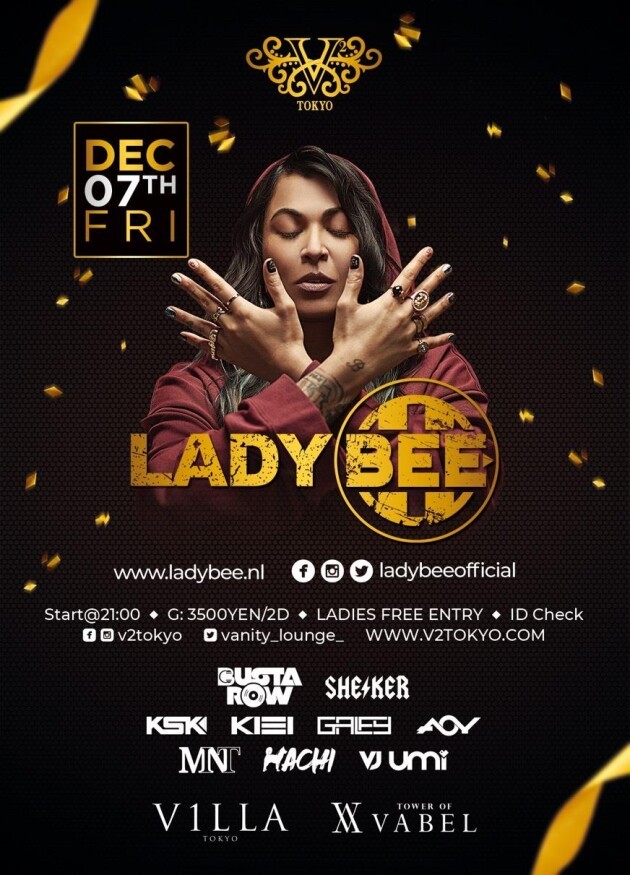 12月7日(金)オランダ出身の女性DJ/MC/プロデューサーの Lady Bee(レディー・ビー)が V2 TOKYO に初来日初登場!そして、翌日8日(土)にはHip Hop Setを VILLA TOKYO にて生披露!