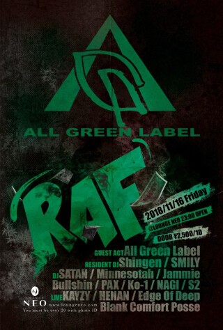 今回は『RAF』メンバーとも親交が深い、東京を中心に活動するインディペンデントレーベル≪ALL GREEN LABEL≫をゲストアクトに召喚。11月もHAPPYな夜をご用意してお待ちしてます。