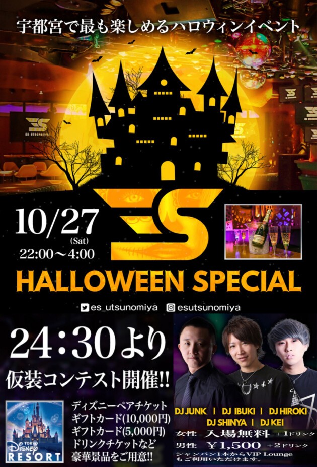仮装して参加で豪華景品のチャンス!! ディズニーペアチケ、1万円ギフト券等、来場者全員にお菓子のプレゼントも!! ESのハロウィンで盛り上がろう!!