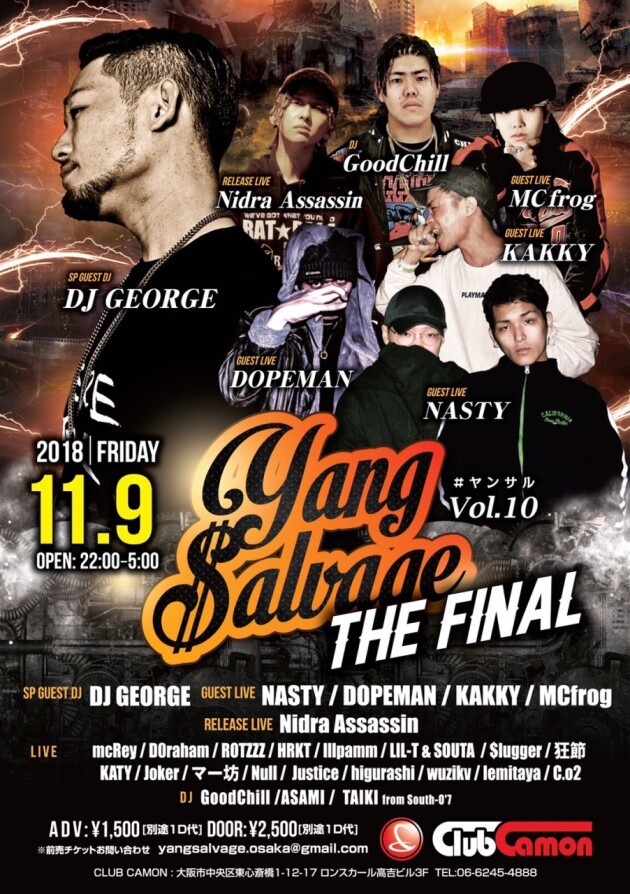【Yang $alvage vol.10 -THE FINAL-】11/9(金)☆奇数月第2金曜開催『ヤンサル』THE FINAL★★SP GUEST DJにDJ GEORGE、GUEST LIVEにNASTY、DOPEMAN、KAKKY、MCfrog、RELEASE LIVEにNidra Assassinが登場☆☆次世代のHIP HOPアーティスト多数出演★★