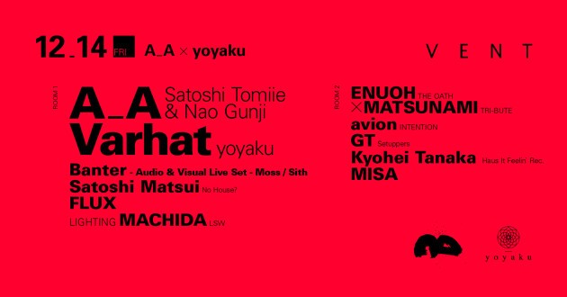 One of the few active electronic music artists that have had such a long-spanning career. The world-renowned legend Satoshi Tomiie together with Nao Gunji have embarked on a new experimental project that only utilizes hardware (meaning no computers), and this will be their first performance in Japan! A_A's debut album is being distributed by yoyaku, so it only makes perfect sense that label owner Varhat also comes to Japan to perform at this epic showcase, at VENT on December 14th!