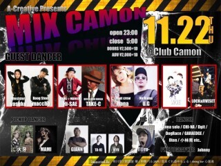 【MIX CAMON】11/22(木/祝前日)☆Studio A-STAR presents『MIX CAMON』★★GUEST DANCERにYasco (Rm sister) & Maccho (HOOD CREW / FAB5BOOGz ALLSTARZ)、TAKE-C (BUSTA JAKK BOOGIE) & Hi-SAE (GANG☆MANISH)、U.G (No Name) & hana (That crew)、WVE、LOCKaJIVESETが登場☆☆さらに豪華ダンサー多数出演★★