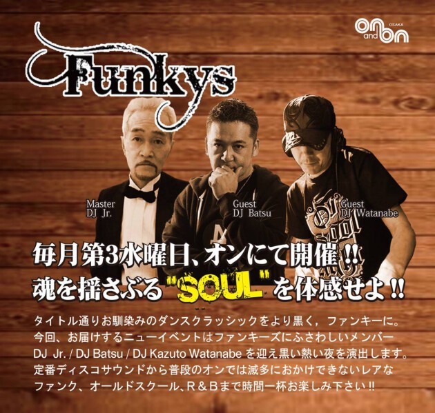 ファンキーズ スペシャル☆ タイトル通りいつものダンスクラシックをよりファンキーに! より黒いサウンドをお届けするイベント。 関西を代表するファンキーDJ BATSUを迎え熱く黒い夜になる事間違いなし。 もちろんオンの定番ディスコサウンドもガンガンいきります! 今宵はファンキーズでファンキーに盛り上がりましょう!