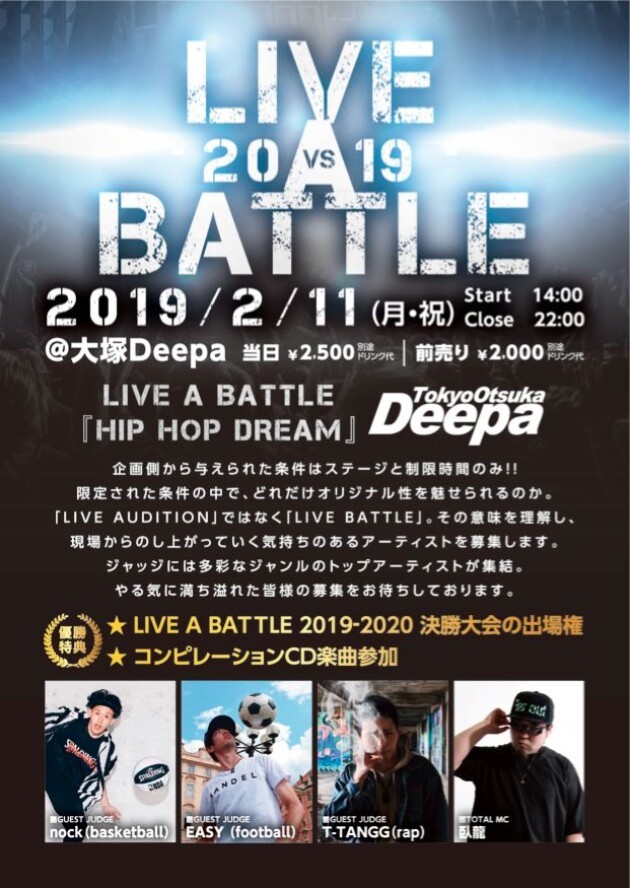 2019年2月11日(祝日)東京・大塚DEEPAで開催決定!!当日、誰が一番いけてんの? 俺は自分はと言うマイクパフォーマー大歓迎!! 優勝者には『LIVE A BATTLE決勝大会出場権』、『コンピレーションCD楽曲参加』